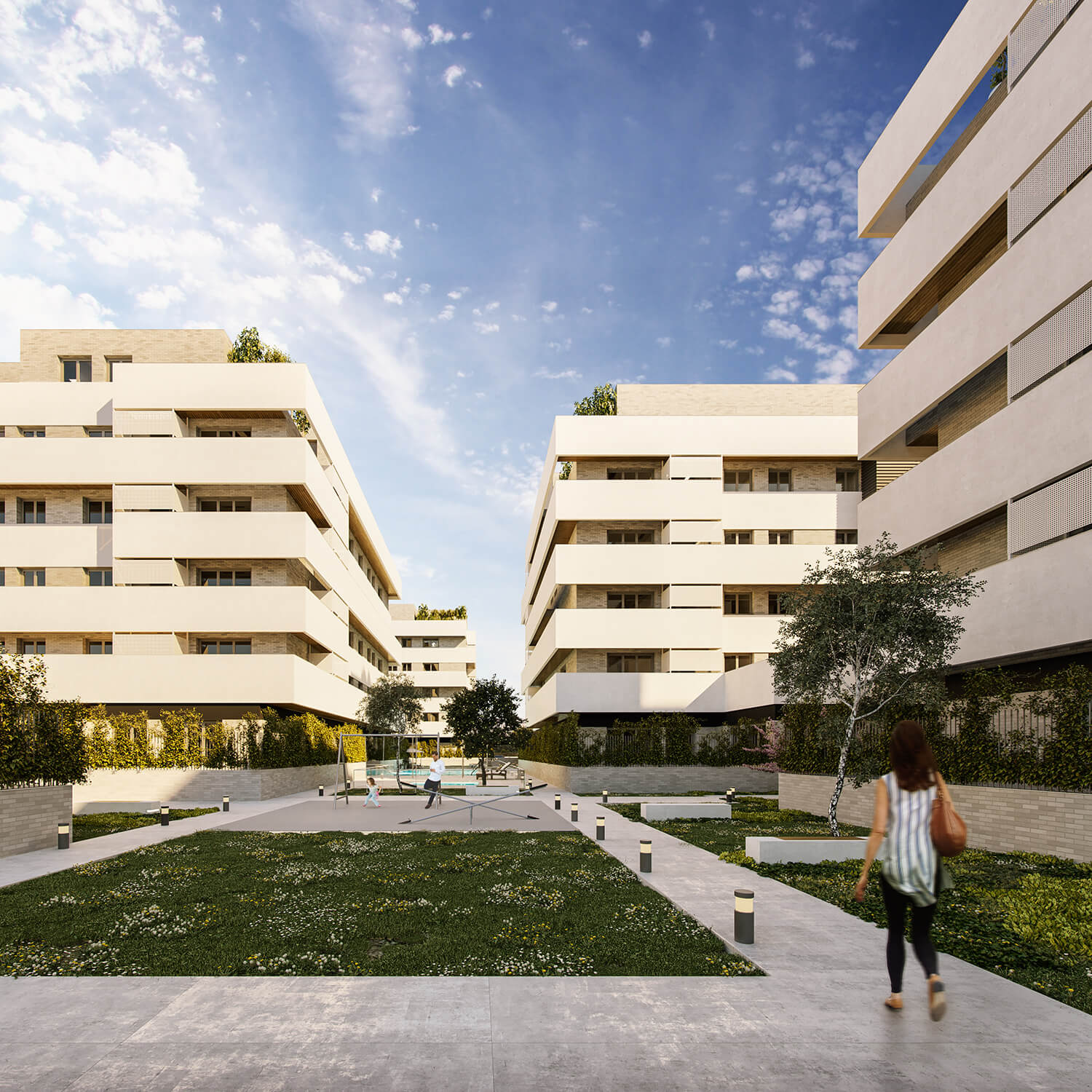La promoción Ribera del Pinar contará con 248 viviendas tipo VPPL con 3 dormitorios, 2 cuartos de baño, amplias terrazas y extensas zonas comunes con piscina, patio y jardín privado.