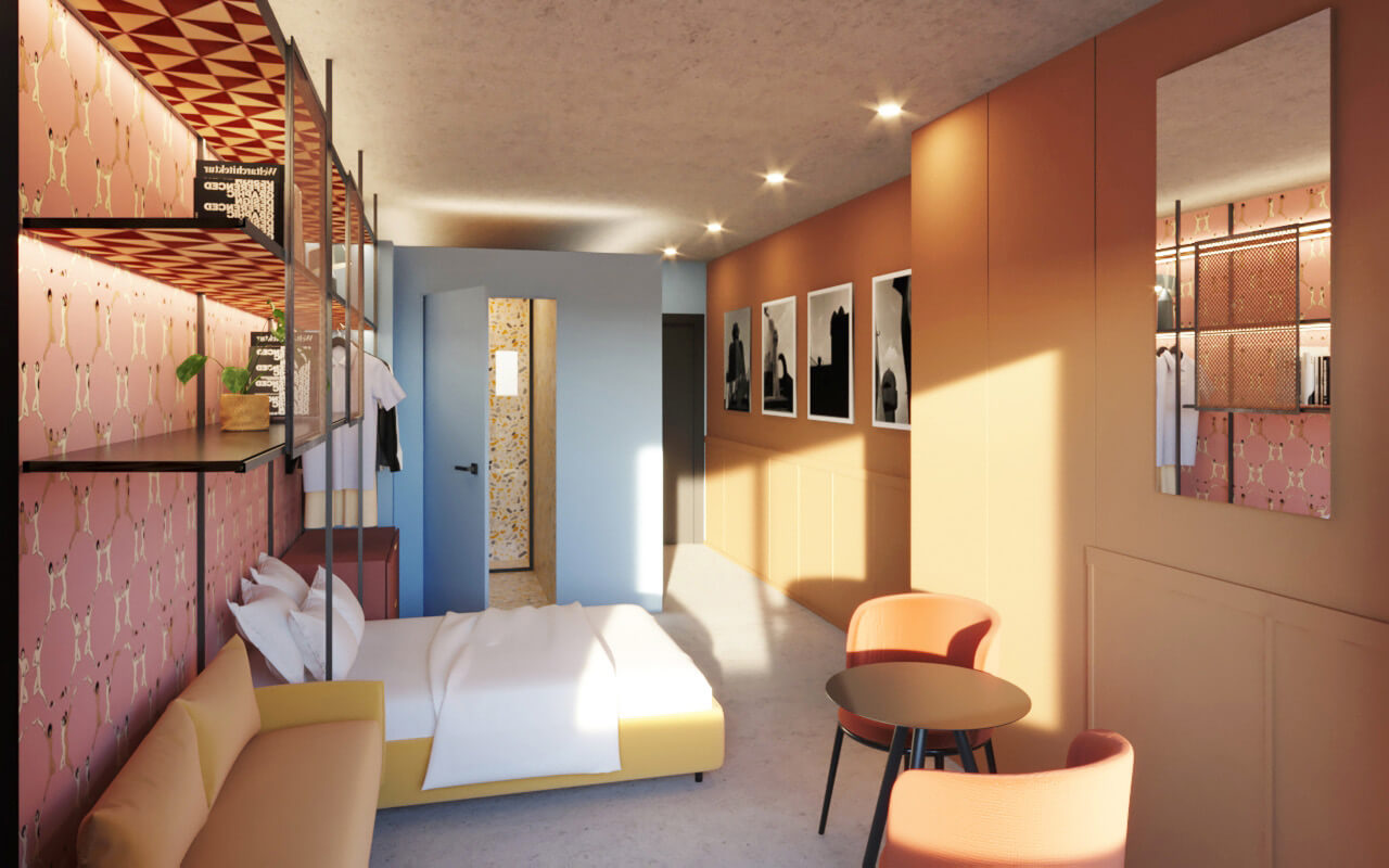 El proyecto consiste en un edificio de seis plantas con una superficie construida de 1.360 m², que albergará 27 habitaciones para alojamiento de corta y media estancia. La planta sótano albergará zonas comunes incluyendo un gimnasio y zona coworking. La planta baja alberga la recepción, cocina común y una amplia terraza y la planta de cubierta dispone de una terraza chillout. Cada planta alberga 5 habitaciones con una superficie útil de 20 m², que incluyen baño y cocina de uso privado.