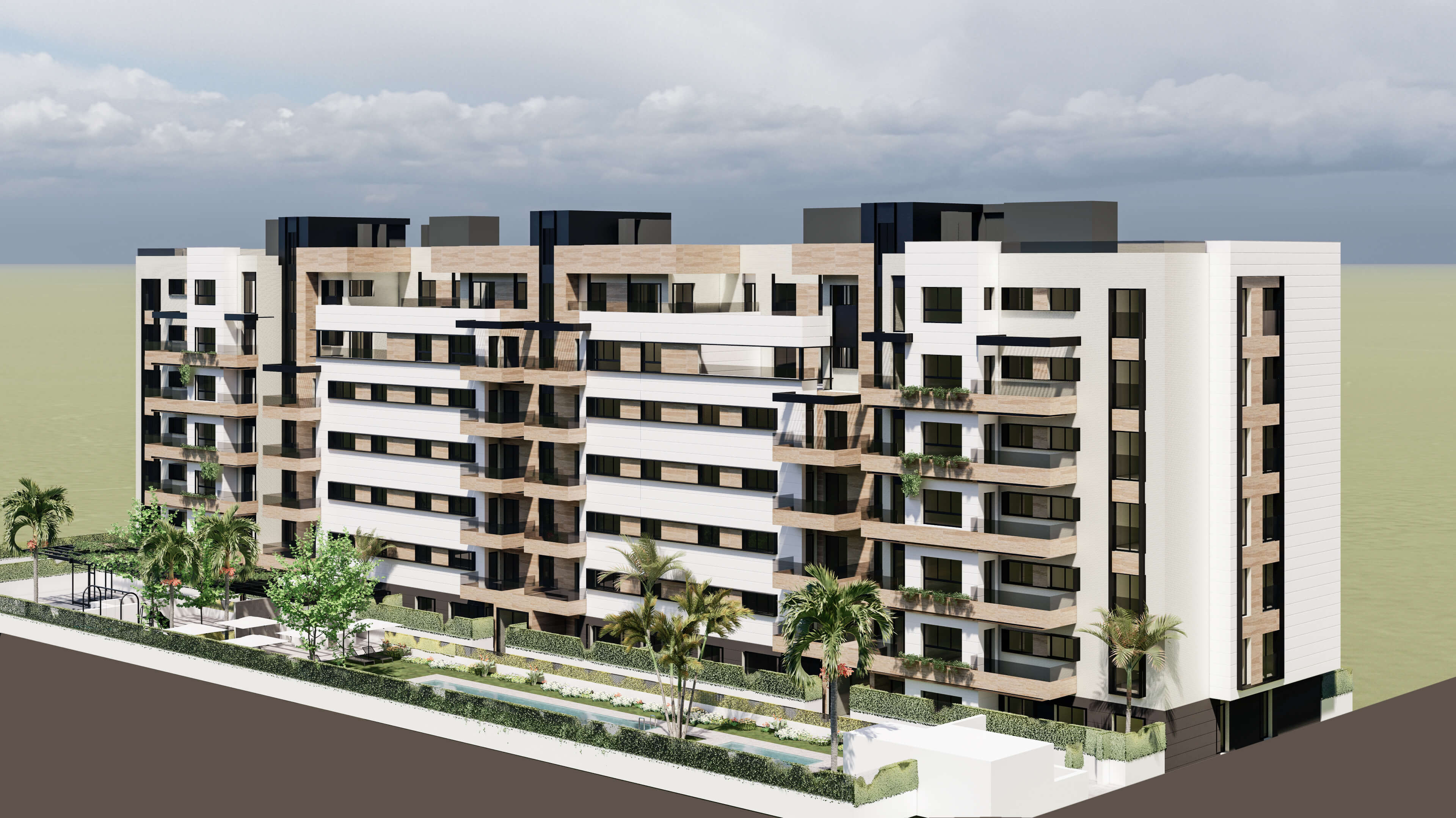 We present a new project that consists of the development of a new residential promotion that encompasses 70 homes with 2, 3, and 4 bedrooms in Córdoba (Andalusia). The project will be composed of 105 parking spaces, of which 70 are associated with the homes and the rest will be for open sale. It also has 70 storage rooms, which are included in the price of the house. The promotion will also include a community pool, landscaped areas, bicycle parking, gym, and chill-out area.